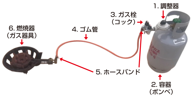 4. ゴム管 5. ホースバンド 6. 燃焼器(ガス器具)