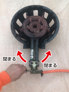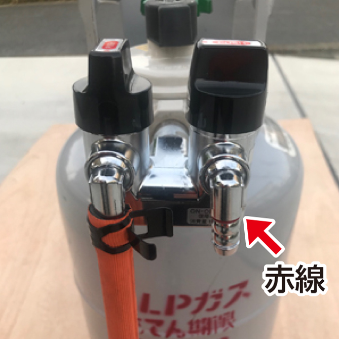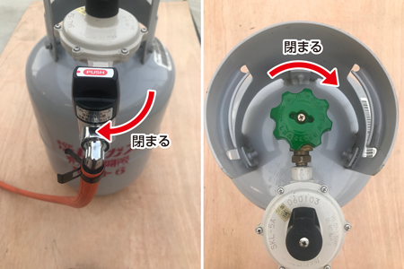 最初に容器のバルブ、調整器のコック、器具のつまみが全て閉じていることを確認してください。