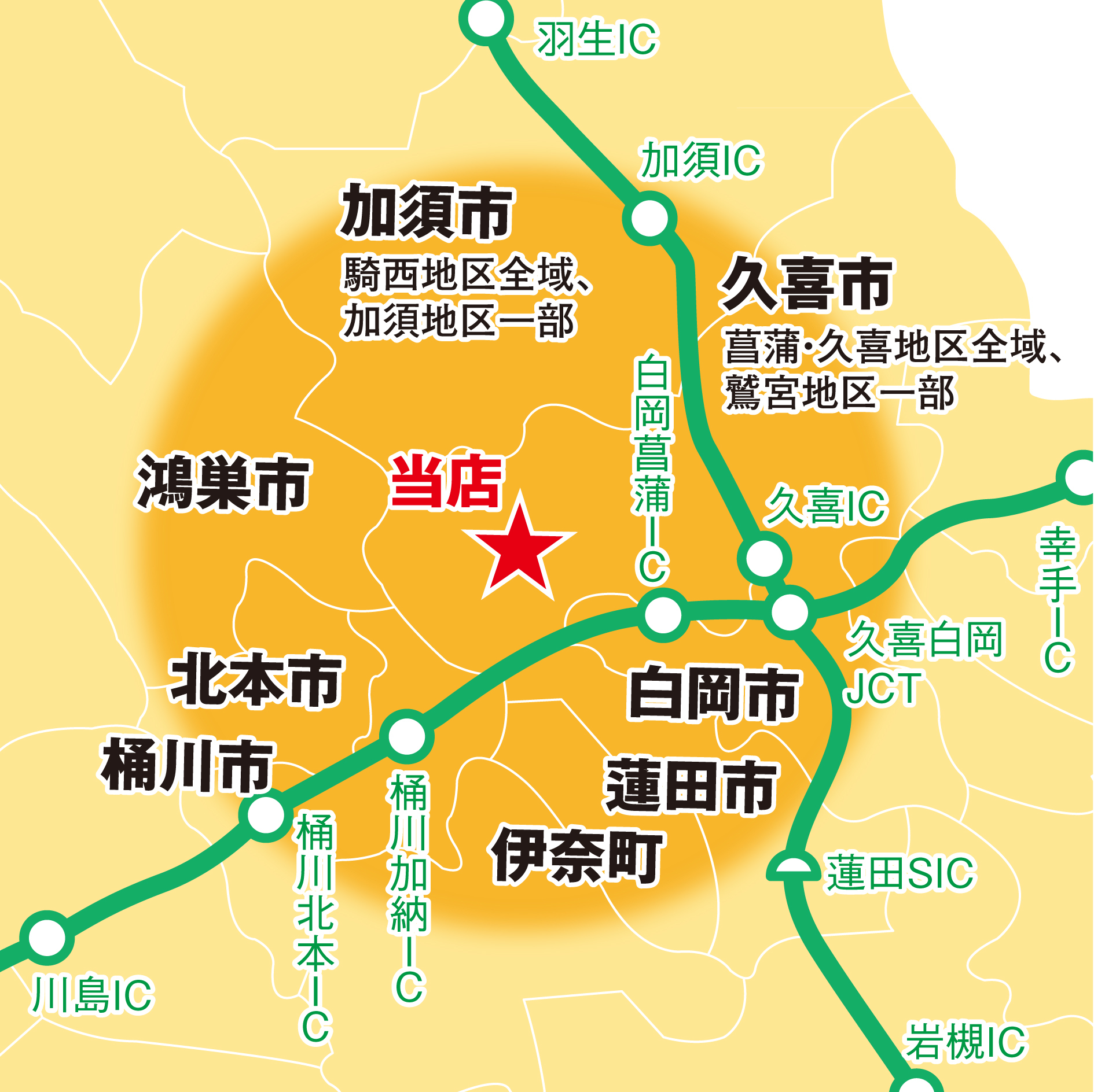 白岡市、蓮田市、鴻巣市、北本市、桶川市、伊奈町